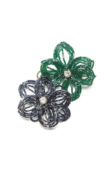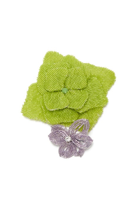 Pétales brodés perle par perle avec amour. Épingles florales en bleu ou vert. Un petit jardin à porter.