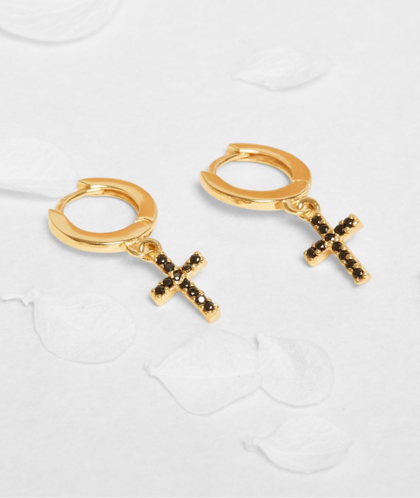 Boucle d’oreilles Etoile mini créoles ornées d’une petite croix de zircons noirs sertie sur une base laiton doré à l’or fin 18 carats 1 micron.