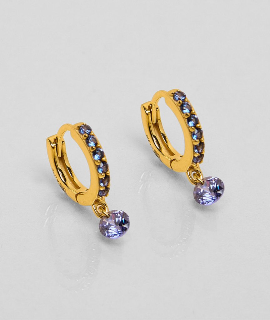 Boucles d’oreilles créoles sur une base laiton dorée à l’or fin 18 carats 1 micron, avec des petits zircons de couleur, une pierre de 4mm en pampille de couleur tanzanite.