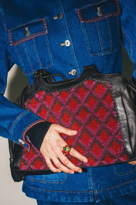 Géométries qui racontent des histoires. Sac shopping spacieux en cuir avec panneaux entièrement brodés à la main, perle par perle avec amour, appliqués sur l’avant et l’arrière. Poignées en cuir et pampilles sur les côtés. Un modèle structuré qui joue avec la graphie et l’artisanat.