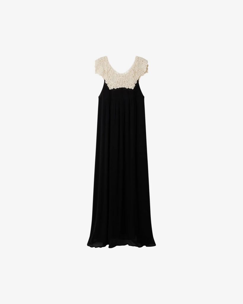 Robe longue en georgette de viscose fluide, avec un plastron en guipure écru délicatement travaillé. La coupe est souple et légère, soutenue par une doublure ton sur ton pour plus de confort et d’opacité. Un modèle à l’allure romantique et intemporelle, contrasté par le duo de noir profond et d’écru raffiné.