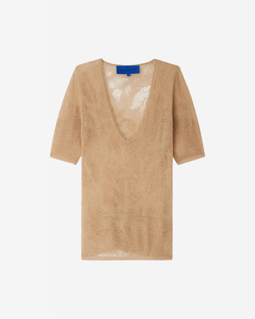 Ce top tee-shirt en alpaca beige séduit par sa matière souple et aérée, travaillée en pointelle comme une dentelle délicate. Le motif de fleurs ajourées révèle la finesse du tricot et la légèreté de la maille, offrant un jeu subtil de transparence. Sa coupe droite et son profond décolleté en V mettent en valeur la silhouette avec élégance et modernité. Une pièce raffinée, à porter seule ou superposée, pour un style féminin et aérien.