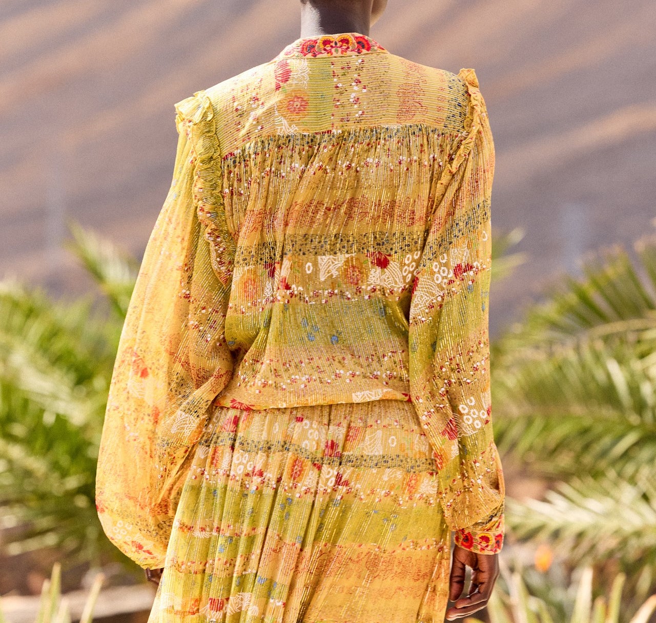 Chemise raffinée en viscose chiffon agrémentée de fils lurex scintillants, apportant une subtile brillance au tissu. Elle se distingue par ses volants délicats aux épaules, ses broderies colorées sur le col et les poignets, et ses manches longues amples qui offrent un volume aérien. Fermeture par petits boutons nacrés à l’avant. À associer avec la jupe “Kaligari” pour un ensemble poétique et lumineux.