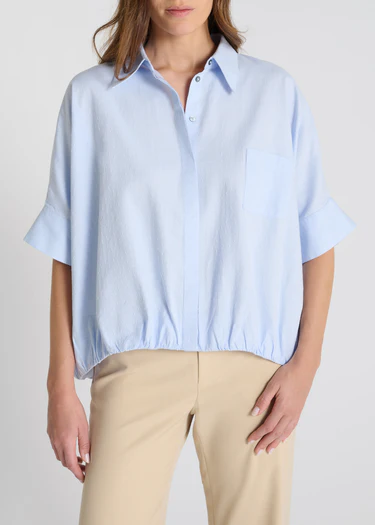 La chemise se ferme par des boutons en nacre dissimulés sous une patte de boutonnage, pour une finition nette et épurée, idéale pour une allure estivale, facile à porter au quotidien.