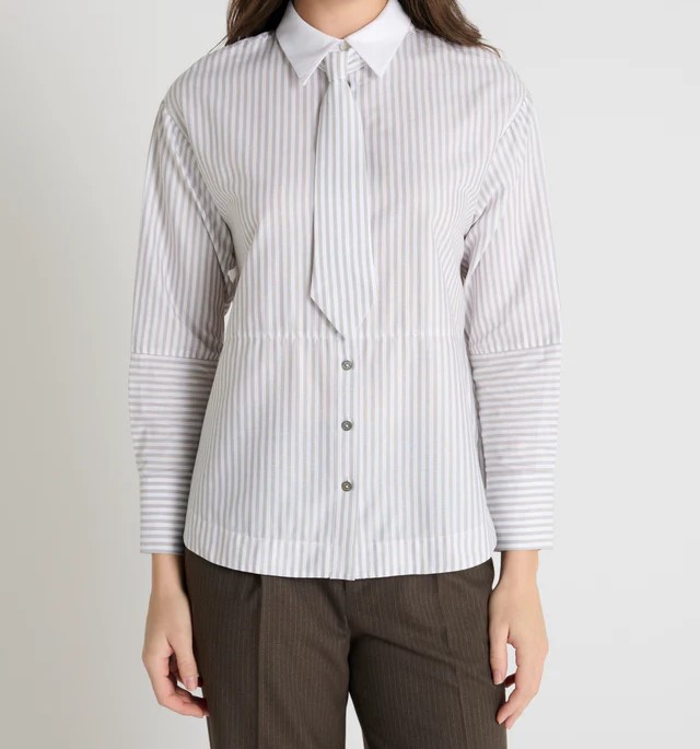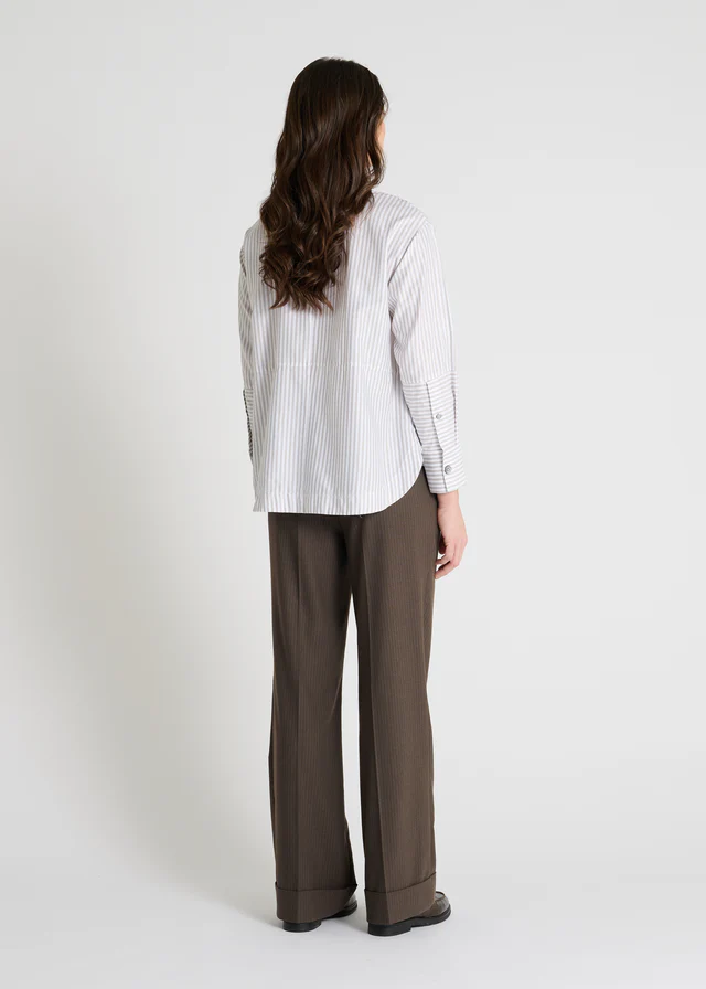 La chemise Sakarig reflète parfaitement l’élégance décontractée propre à Hana San. Réalisée en twill 100% coton, elle présente un subtil jeu de rayures blanc et grège, offrant une palette douce et moderne. Sa coupe légèrement loose est conçue pour allier confort et liberté de mouvement. Le col blanc contrastant et la cravate amovible ajoutent une note d’audace et de modernité, permettant de varier les styles au fil de la saison. Les empiècements délicats témoignent du savoir-faire minutieux de la maison et apportent du relief à cette pièce à l’allure classique mais riche en détails raffinés. Les boutons en nacre grise, au niveau du boutonnage central comme aux poignets, apportent une touche de sophistication discrète. Parfaite pour la mi-saison, la chemise Sakari g pour femme se marie aussi bien avec un pantalon tailleur qu’avec un denim brut, pour un look contemporain, entre structure et fluidité.