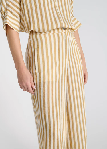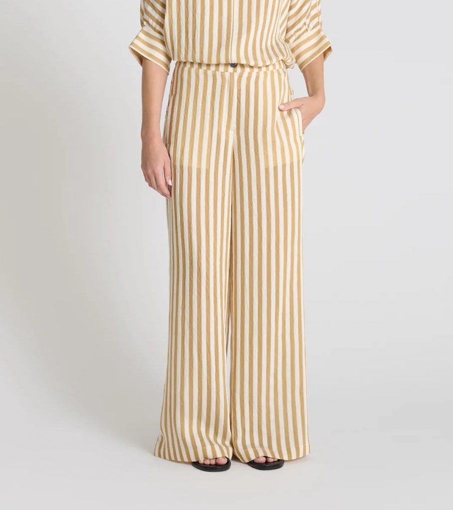 Le pantalon Genepi est confectionné dans un voile léger à rayures verticales, qui allonge naturellement la silhouette. Il présente une jambe ample et évasée, pensée pour un porté fluide et confortable.