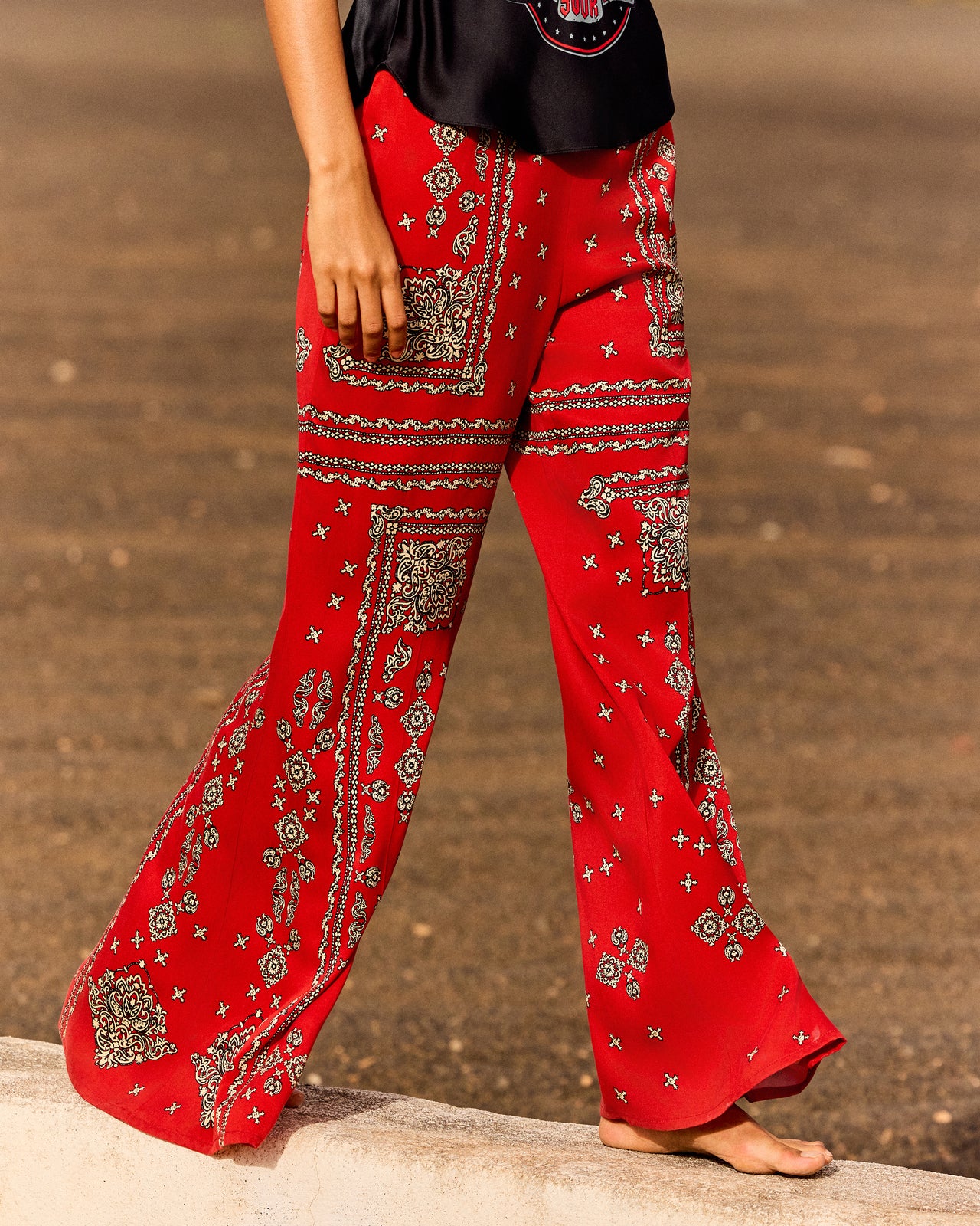 Pantalon fluide en viscose satinée rouge au toucher soyeux et au tombé élégant. Sa coupe patte d’éléphant allonge la silhouette, tandis que la taille élastique assure confort et maintien. Les poches côtés ajoutent une touche pratique et décontractée. L’imprimé bandana placé apporte un style bohème et lumineux. À associer avec le top “Glori” pour un ensemble raffiné et coordonné.