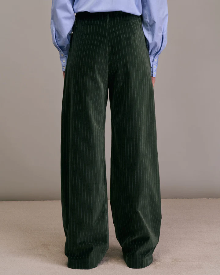 Pantalon aux jambes évasées, poches latérales et une taille boutonnée.