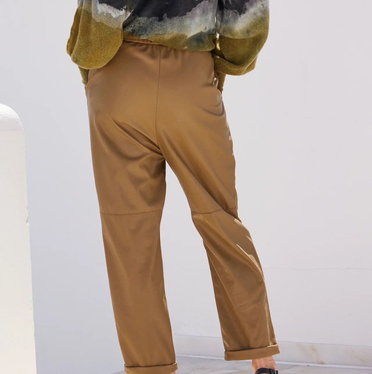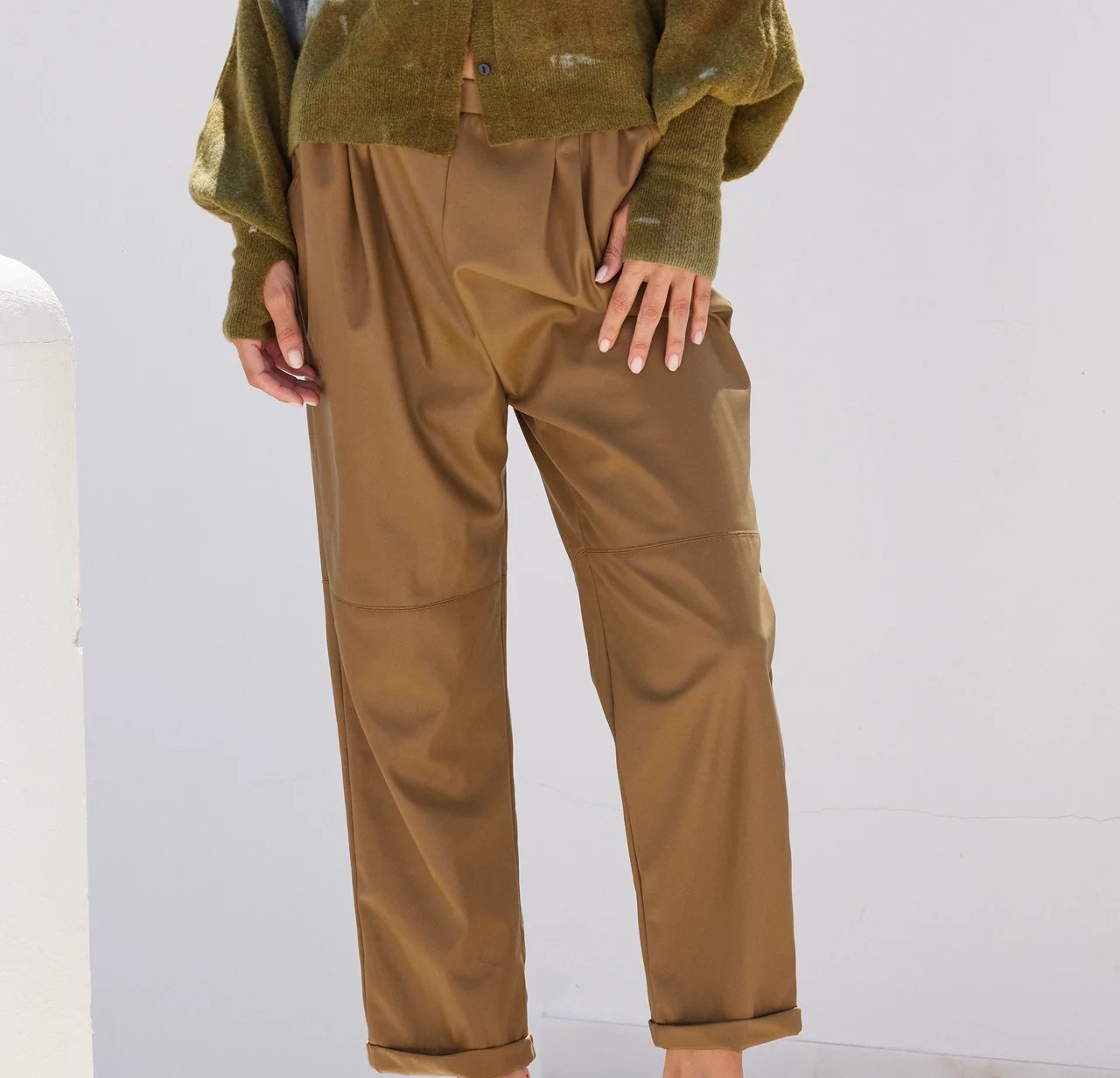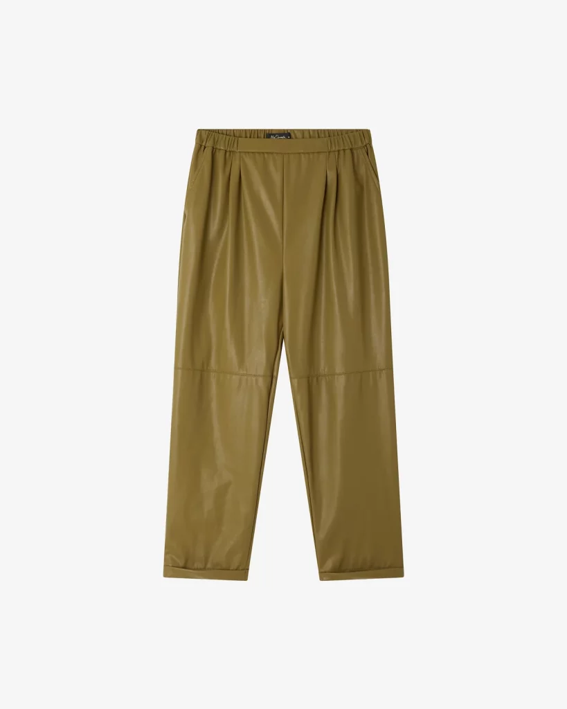 Pantalon droit en simili cuir souple de couleur kaki, à la coupe souple et confortable. Taille élastique pour un porté facile, poches latérales discrètes et petit revers en bas de jambe pour une touche de finition soignée. Une pièce à l’esprit casual chic, parfaite à associer à une maille douce ou une chemise fluide pour un contraste de textures.