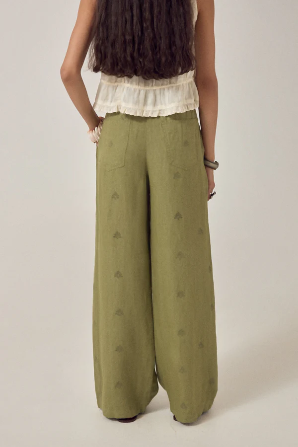 Pantalon droit en mélange coton-lin. Coupe ample et fluide. Taille basse confortable avec plis sur le devant. Fermeture boutonnée et zippée, poches latérales et arrière.
