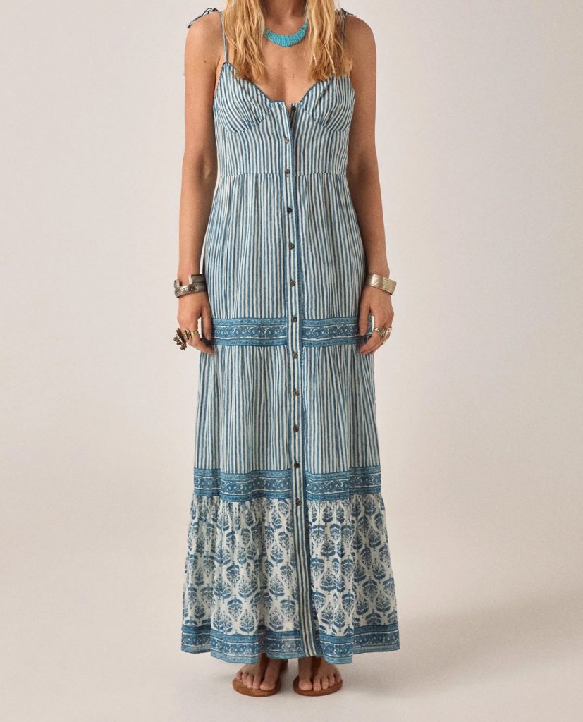 Robe longue en coton léger. Décolleté en V, bretelles ajustables à nouer aux épaules, fermeture boutonnée sur le devant. Corsage ajusté, taille froncée, jupe à volants. Rayures verticales turquoise et ivoire bordées d’imprimés géométriques à la taille et à l’ourlet.