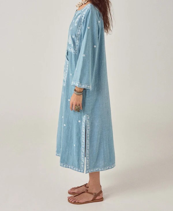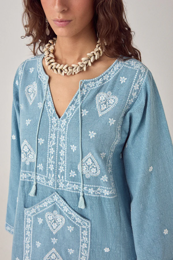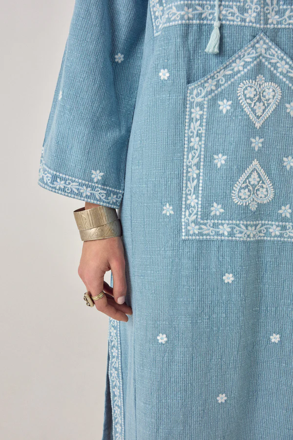 Le bleu est un ciel délavé – doux, patiné, comme s’il avait déjà profité du soleil pendant plusieurs étés. Le coton rayé possède une texture naturelle qui donne de la profondeur à la broderie – le fil blanc sur ce bleu apaisant, le travail est dense mais l’ensemble reste léger.