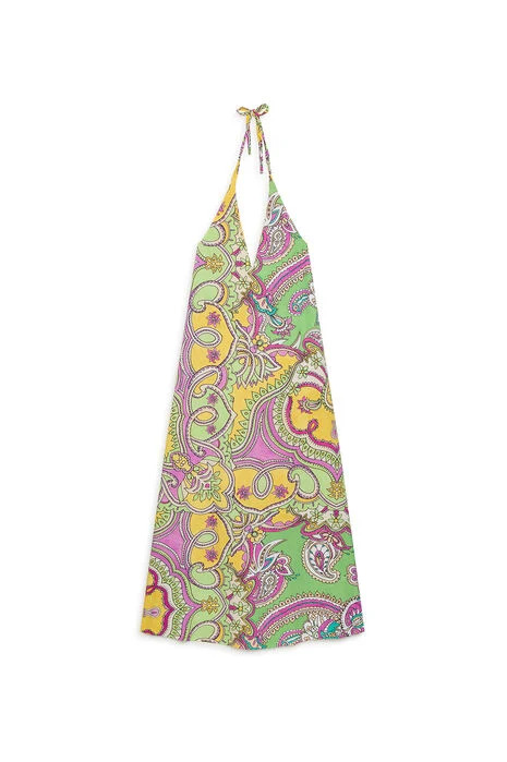 Robe longue en jersey léger extensible en polyamide, avec encolure américaine et dos nu. L’imprimé maxi paisley intégral la rend vibrante et lumineuse. Fraîche et fluide, elle accompagne chaque mouvement avec naturel. Parfaite pour les journées d’été ou les soirées au bord de la mer, à porter avec des sandales plates ou des bijoux en nacre.