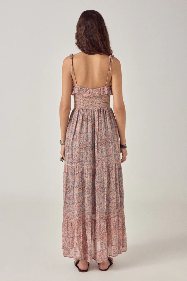 Robe longue en viscose rose poudré chaud, ornée d’un imprimé cachemire intégral dans des tons terracotta délavé, bleu clair et crème. Fines bretelles à nouer sur le haut. Corsage smocké avec volants et petite patte de boutonnage. Jupe à volants ample et fluide. Coupe fluide et ample à partir de la taille.