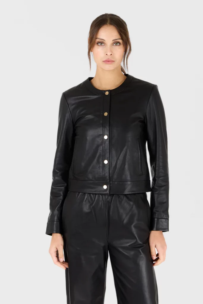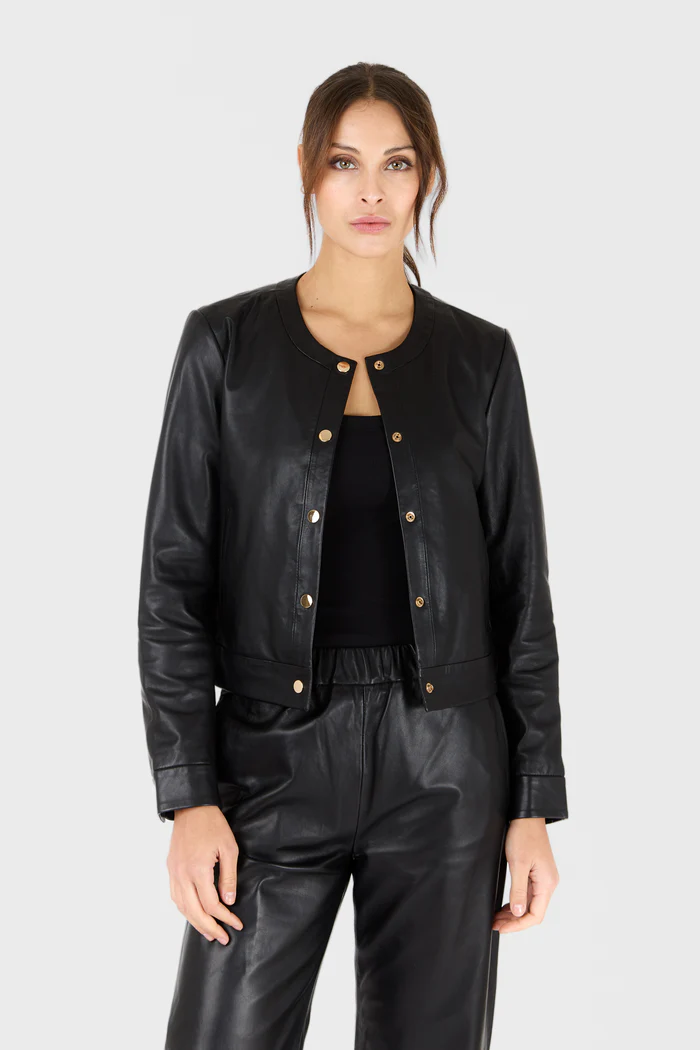 Découvrez le blouson MARION, une pièce intemporelle confectionnée en cuir d’agneau d’une souplesse et d’une finesse incomparables.